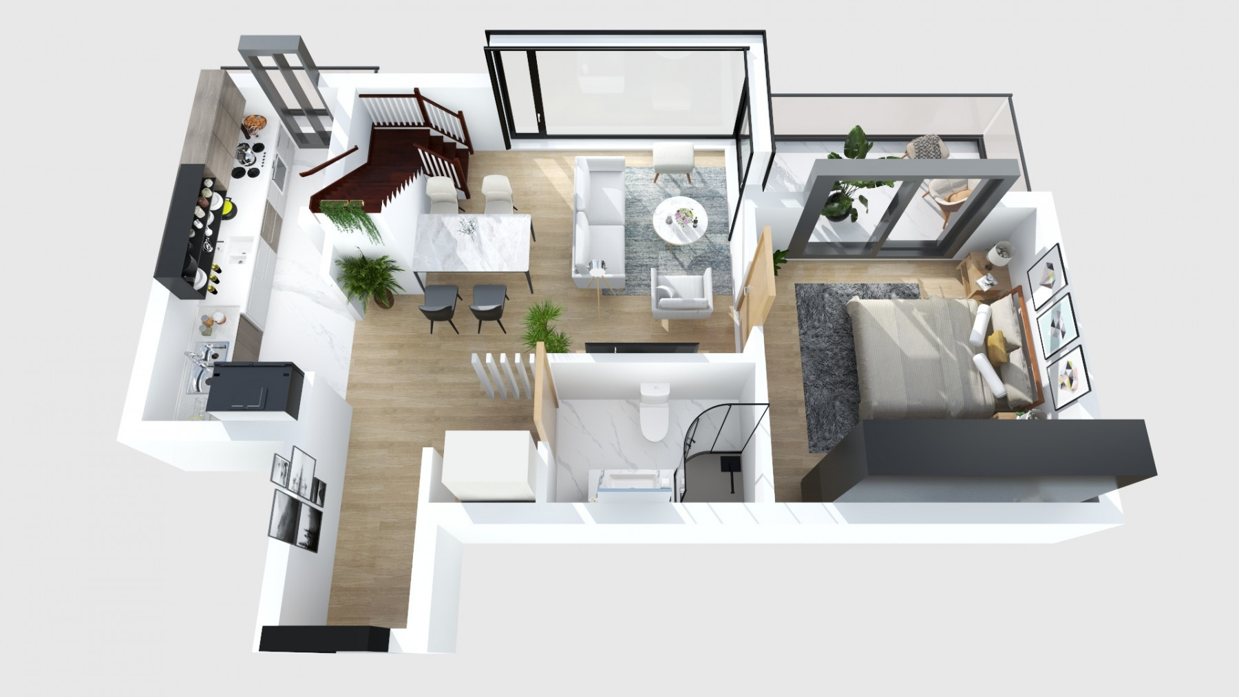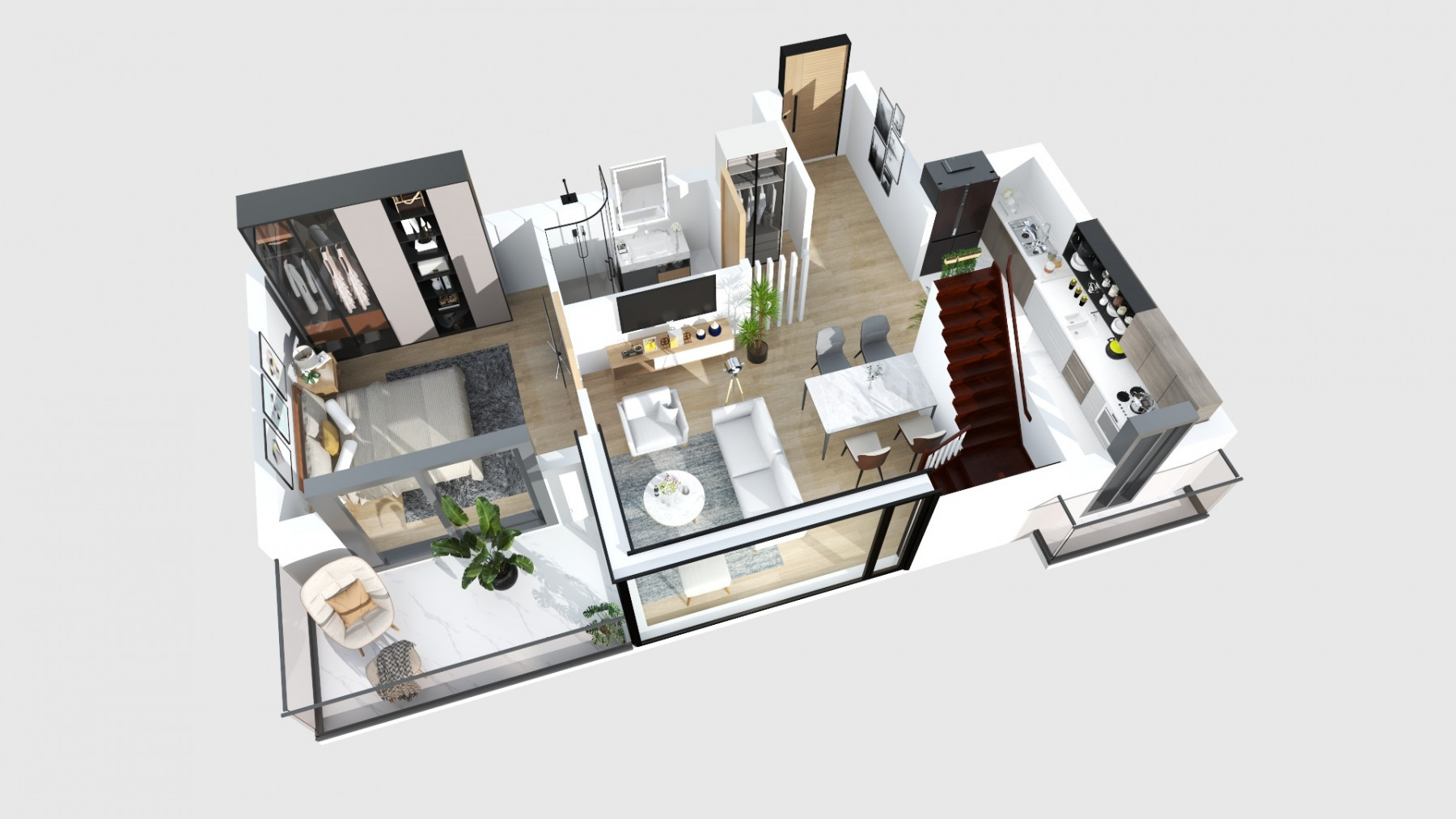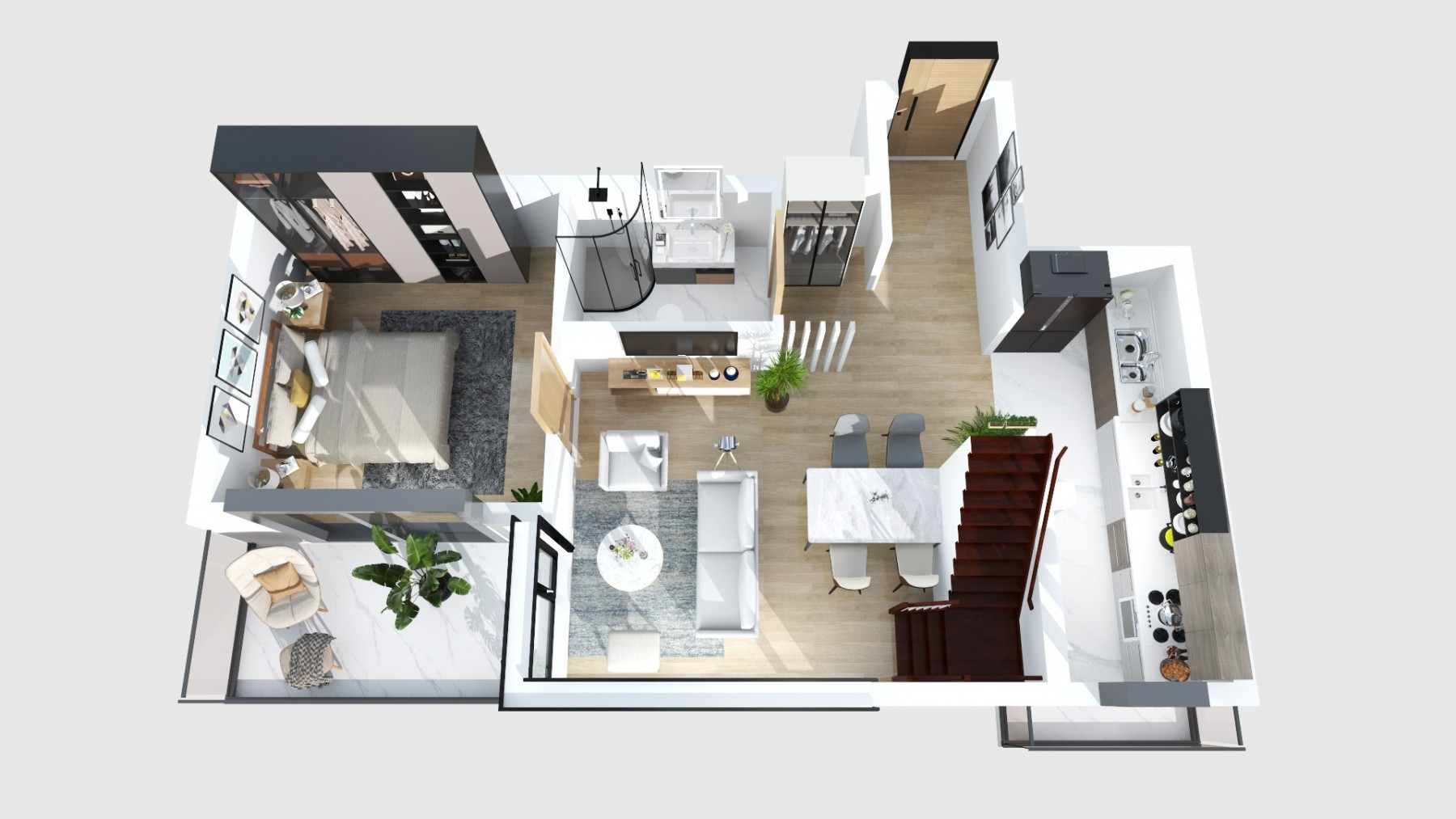- la primul nivel, in zona de intrare un hol cu zona de cuier si o debara cu spatiul masinii de spalat rufe incorporat; Zona de zi este compusa dintr-un living spatios si o bucatarie deschisa catre acesta, dar care se poate si separa. Tot din zona de zi avem acces pe terasa de 7,5mp, acesta fiind expus catre Sud, un loc ideal pentru a te relaxa; mai avem un dormitor si o baie.