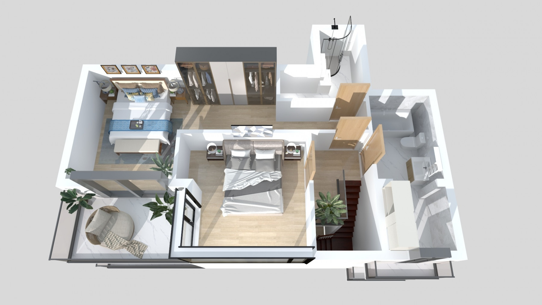 - la al 2-lea nivel avem 2 dormitoare, primul este dormitorul matrimonial care are dressing si baie proprie; al 2l-ea dormitor are acces pe terasa, iar pe hol avem o alta baie. Ambele dormitoare au acces pe o terasa de 7,5mp cu expunere catre Sud.