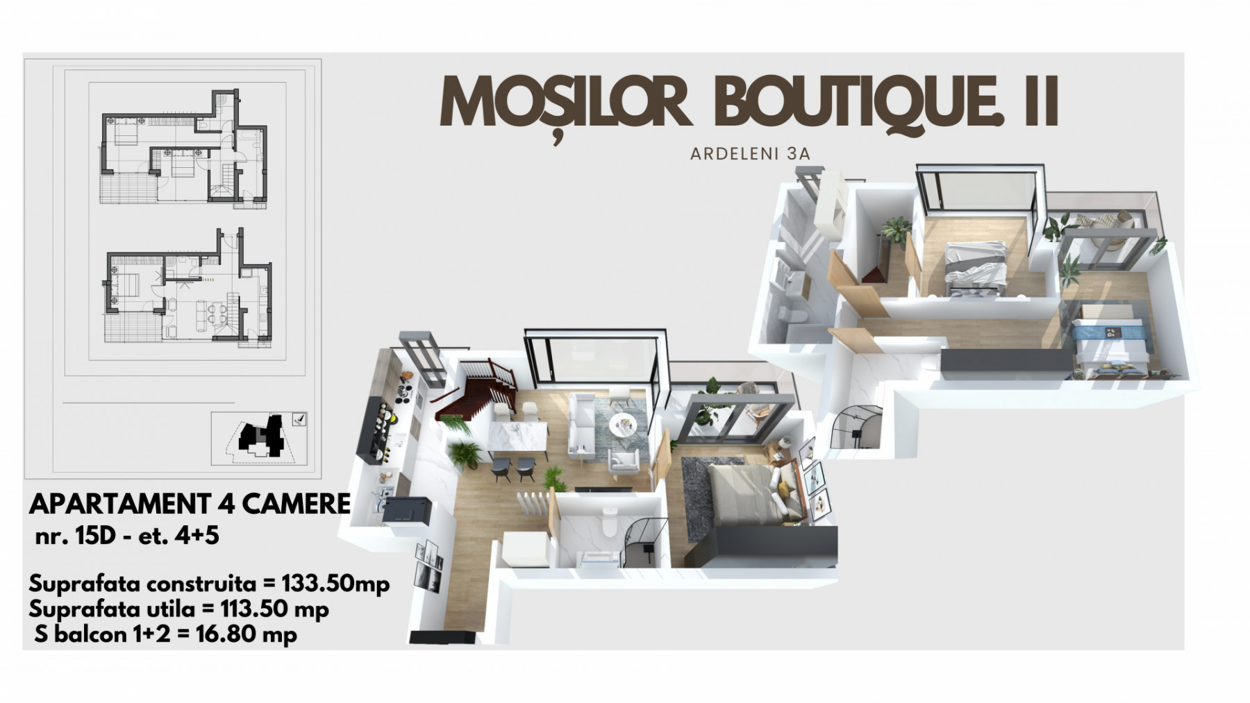 Va prezentam spre vanzare un apartament duplex situat la etajele 4+5 cu 4 camere, in zona Dacia-Mosilor, intr-un bloc nou.